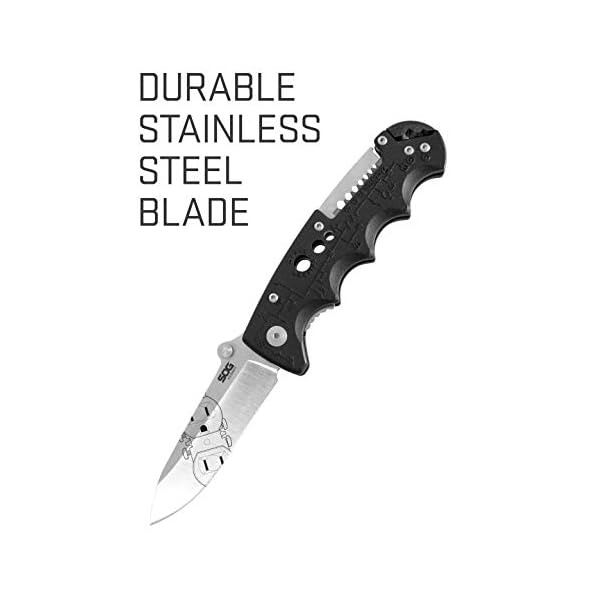 It includes a stripper bar for wire sizes of 12-24, an adjustable spring-loaded UPT/wire stripper in the back, and, just in case, SOG’s patent pending hole stripper that uses the main blade. Schematic grips, high-voltage tower clip, insulator thumb stud, and a 3.4 inch blade are signatures that make this a very unique liner lock knife. All SOG products are guaranteed against defects in workmanship and materials for the life of the original purchaser.